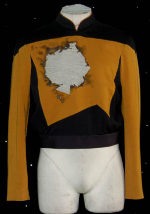 A costume featured in various Star Trek: Voyager episodes for wear by Kate Mulgrew in her portrayal of “Captain Janeway”. The costume is a black Starfleet uniform jumpsuit with an affixed gray undershirt attached at the waist, and a black open front Starfleet uniform jacket with command red shoulders. The … |