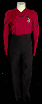 “Captain Janeway” (Kate Mulgrew) was captain of the U.S.S. Voyager throughout the Star Trek: Voyager series. This costume was made for use by Captain Janeway in the Star Trek: Voyager episode “The Q and the Grey” in which “Q” (John DeLancey) asked Janeway to mother his child in order to … |