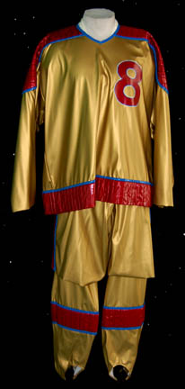 This great ice-hockey costume was worn by “Tom Paris” (Robert Duncan McNeill) in the Star Trek: Voyager episode “Critical Care” in which he played a game of holodeck ice-hockey with “Harry Kim” (Garrett Wang). The costume includes a gold vinyl jersey with red quilted vinyl band around the waist and … |