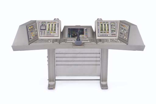 A prop spaceship control console with <I>NX-01</I>-style backlit simulated instruments and simulated buttons and a pilot's control stick -- <I>71x34x38½in.</I> -- used in the inspection pod set and other space vehicles in <I>Star Trek: Enterprise</I> |