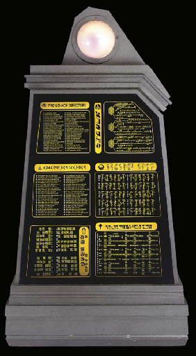 A freestanding display sign featuring backlit art and framing in Cardassian style, painted as metallic pewter -- <I>57x105in.</I> -- used as set dressing in the promenade set of <I>Star Trek: Deep Space Nine</I> |