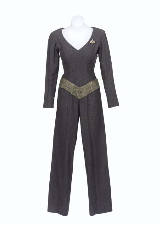 A grey cotton jumpsuit, with Starfleet communicator badge -- worn by Marina Sirtis as Deannna Troi in <I>Star Trek: The Next Generation</I>, with corresponding wardrobe tag |