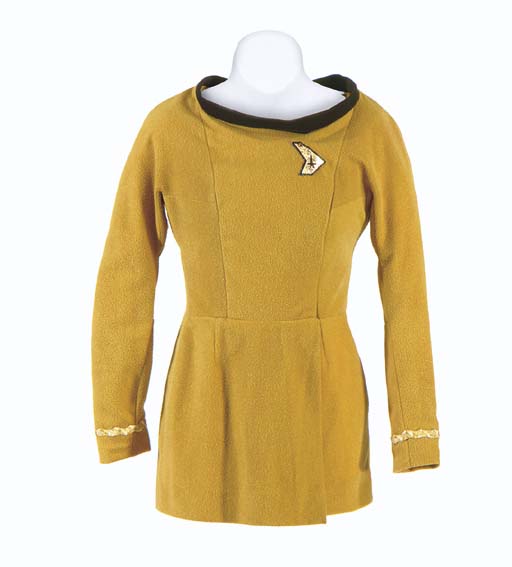 | (Paramount, 1979) Crème colored short-sleeve tunic with buckle and Starfleet emblem on the left chest, worn by Nichelle Nichols as “Lt. Cmdr. Uhura” in Star Trek: The Motion Picture. |