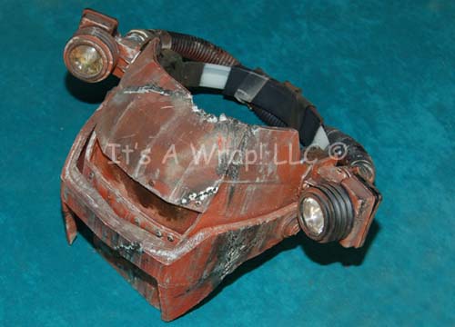 A prop mining mask featured in Star Trek VI: The Undiscovered Country for use by alien prisoners in the dilithium mines of Rura Penthe. The item is sturdy molded plastic painted rust red with multiple points of distress to appear ‘abused’, some spotting of metallic silver paint to appear metal. … |