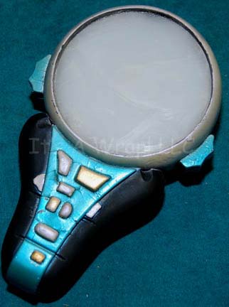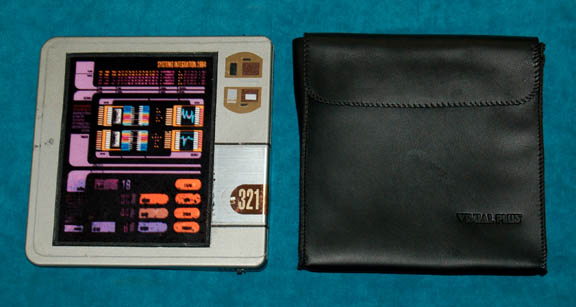 A sturdy molded foam rubber Vulcan hand scanner like the one featured in the Star Trek: Enterprise episode “The Shipment”. The item features a white acrylic circle shaped ‘display screen’ with a hand grip that has multi-colored faux buttons. The item is painted metallic blue with black elements, metallic gold … |