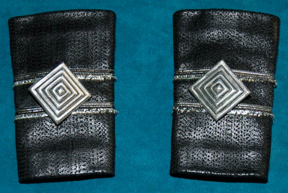 A pair of wardrobe accents featured in the Star Trek: Enterprise episodes “In a Mirror, Darkly, Parts I and II” for wear on Starfleet uniforms in the Terran Empire of the Mirror Universe. The items are black faux leather shoulder boards with a pair of silver colored fringe strips ringing … |