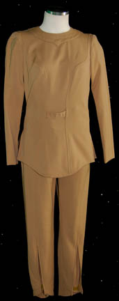 A tan 2-piece Class-A Starfleet uniform featured in Star Trek I: The Motion Picture. The lot comes with an unattached plastic bio-monitor, unattached matching cloth covered shoes, and a sciences orange backed Epsilon IX station assignment patch for the left breast. The item is intended for female wearers. The trousers … |