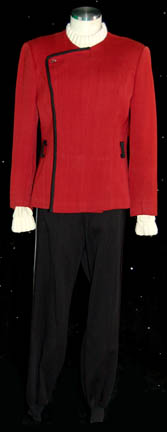 A Starfleet officer's uniform appearing in various Star Trek feature films. The costume is a set of black trousers with a gray division stripe running up the outside seams of the legs, with a command white long sleeved undershirt with a ribbed collar and cuffs, a maroon officer’s jacket with … |