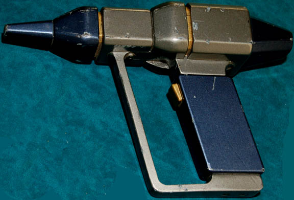 A prop weapon similar to that featured in the Star Trek: The Next Generation episode “The Survivors” but with a different color scheme. This item is a low-yield phaser pistol resin cast in gray featuring blue accents, a gold-colored “trigger” button and detail; item has mild distress due to time … |