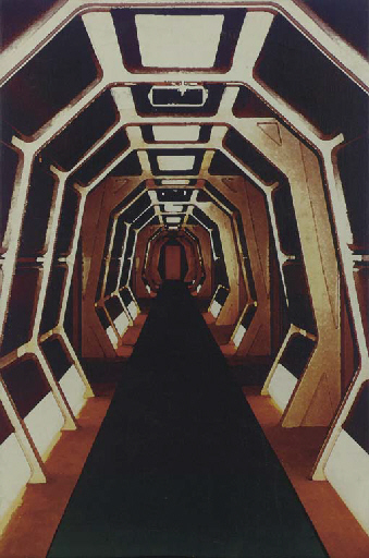 Four simulated oil paintings and one acrylic painting, two images depict a blacksmith at work, one a glowing hand, apparently forged by the blacksmith, one bird's wing, and one shows the <I>Enterprise-D</I> corridor, largest -- <I>24x36in.</I> -- created in the <I>Star Trek</I> art department for "Birthright" in <I>Star Trek: The … |