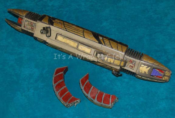 A prop photon torpedo with characteristic elliptical cross section and rounded ends, made from wood and particle board, textured and painted as metallic pewter -- <I>83x33in. wide</I> -- believed to be an original torpedo prop made for <I>Star Trek II</I> or <I>Star Trek III</I>, this torpedo was repainted and refinished … |