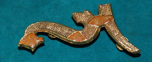 A molded metal badge created for wear by Vulcan characters in various episodes of Star Trek: Enterprise. The item is gold colored metal with orange marmalade colored ‘jewel’ insets, and pin backing for affixing to a costume. The item measures approx. 4 X 2.25 inches. Costume continuity guides indicate the … |