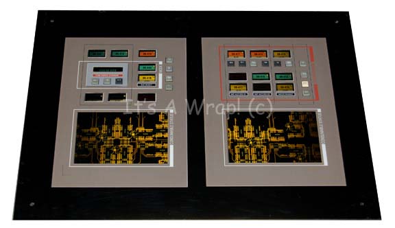 A large piece of set dressing featured in various episodes of Star Trek: Enterprise. This item is composed of a piece of smoked acrylic with twin, gray, graphical applications adhered to the front featuring multiple rubber, faux buttons with numerical values, labels reading things like “CMD EMER OVERRIDE” or “ATM … |