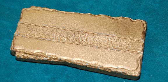 A prop latinum bar like those appearing variously in episodes of Star Trek: Deep Space Nine. The item is a piece of molded resin painted metallic gold measuring approx. 4.75 X 0.5 X 2.25 inches. |