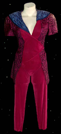 A costume featured in the Star Trek: Deep Space Nine episode “The Emperor's New Cloak” for wear by Chase Masterson as “Leeta”, a member of the Terran Rebellion. The costume is plum colored tights over which is worn a blue suede bodice with attached long sleeves with a red and … |