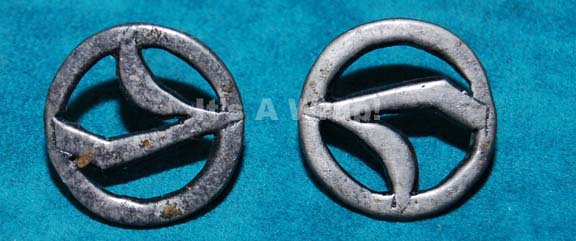 A lot of two Klingon themed accessories for wear on uniform gorgets. Items like this appeared in episodes of Star Trek: The Next Generation, Deep Space Nine, and more. The items are molded metal with Klingon iconographic lettering centered in their circle frame. They are wire backed for fastening into … |