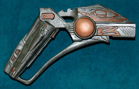 A prop item similar to those featured in various episodes of Star Trek: Deep Space Nine like “Jem’Hadar”. This item is a gray, rubber-cast pistol featuring a molded hand grip, a black, raised accent on the end, silver-colored accents in the middle that emulate the circuitry of the device; an … |