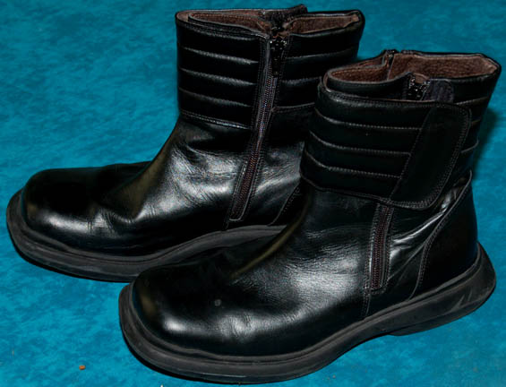 A pair of black size 8 male boots for wear with a Starfleet uniform jumpsuit (sold separately). The boots are black leather with zippers on either side of the ankle and a Velcro flap covering the outside. The inner label reads ‘Alfani, Made in Italy'. |