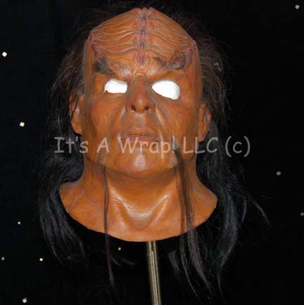A Klingon head latex appliance featured in the courtroom scene of Star Trek: The Undiscovered Country. Instead of putting all two hundred extras in full prosthetics, these full head masks were created. This latex head has been completely painted and airbrushed with hair attached behind the forehead ridges and braided … |