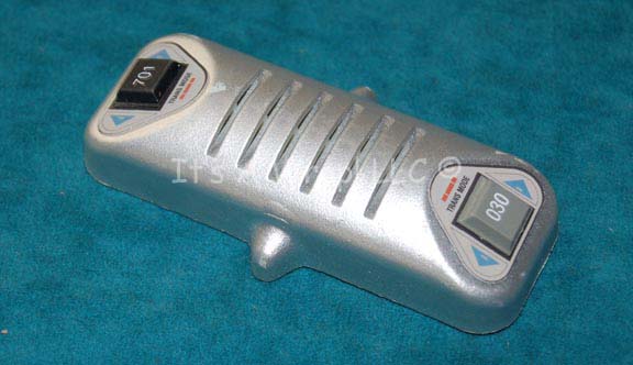 A prop universal translator featured in the Star Trek: Enterprise episode “Demons” and “Terra Prime” for wear by “Thoris” (Joel Swetow). The item is injection molded plastic painted metallic silver with graphical applications adorning both ends of the item and a pair of rubber faux buttons with numeric values colored … |