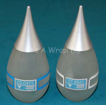 A lot of two tear drop shaped frosted glass containers like those appearing variously in episodes of Star Trek: Enterprise on the sickbay set of the “Enterprise NX-01”. The items feature metallic silver painted cone shaped lid toppers and Starfleet inventory applications themed in white and blue with white cadesus … |