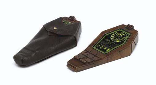 Two prop data devices with backlit simulated screens displaying Ferengi graphics, with one leather carrying case -- <I>7¼in. long</I> -- believed made for <I>Star Trek: Deep Space Nine</I> (2) |
