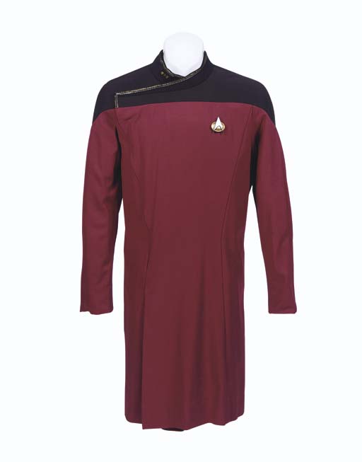 A black and burgundy first season <I>Star Trek: The Next Generation</I> -style Starfleet dress uniform, with rank pips and Starfleet communicator badge -- worn by Jonathan Frakes as William Riker; with corresponding wardrobe tag |