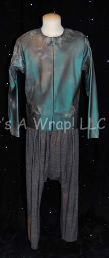 A costume featured in the Star Trek: Enterprise episode “Shadows of P'Jem”; wherein a group of Coridan rebels shoot “Captain Archer” (Scott Bakula) and “T’Pol” (Jolene Blalock) down and take them prisoner. This costume consists of an iridescent black and purple vinyl shirt with a zip up the front, and … |