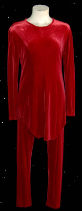 A costume featured in various episodes of Star Trek: Voyager, for wear by Roxann Dawson in the role of the Chief Engineer of the Starship “Voyager”, Lieutenant B'Elanna Torres. The costume is a long-sleeved red velvet tunic with a zip up the back and corresponding trousers. A sewn in tag … |