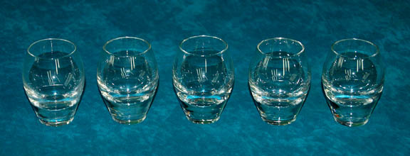 A set of five shot glasses procured for various Star Trek television episodes. With a unique ocular shape and a weighted base this lot makes an attractive selection. Measures approx. 2.5 X 1.75 inches. |