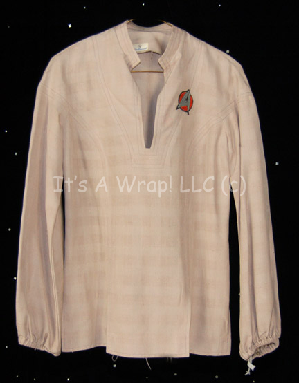 A costume item featured in the first Star Trek feature film. This item is a long-sleeved, tan-colored, Starfleet uniform shirt with an orange colored USS Enterprise mission patch sewn into the left breast indicating the wearer to be in ‘sciences division'. A sewn in Paramount tag reads merely “8”. |
