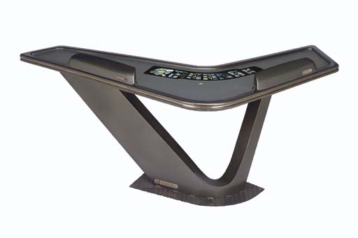 An L-shaped futuristic desk with cantilevered base, painted as metallic pewter with plastic laminate tabletop with simulated control and display panels -- <I>35x96x48in.</I> -- used as set dressing on the <I>Enterprise-E</I> |