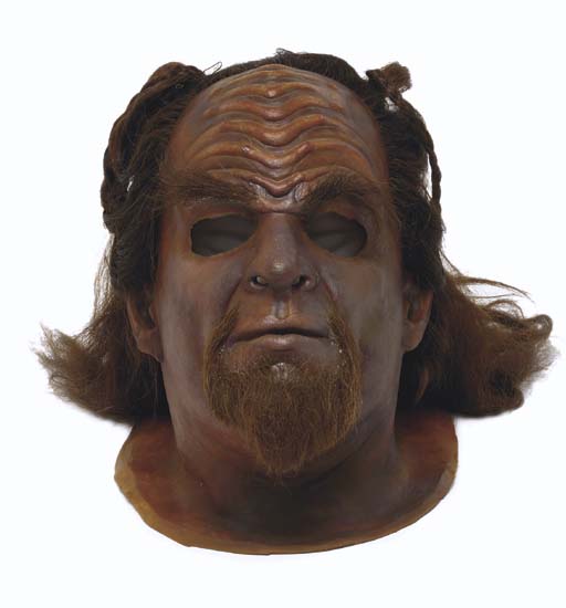 A full head mask cast from latex, fully painted and airbrushed, with ridged forehead, hair, eyebrows and beard -- made for a background Klingon warrior in the courtroom scene in <I>Star Trek VI: The Undiscovered Country</I> |