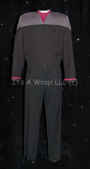 A costume featured in Star Trek X: Nemesis for wear by stunt performers portraying “Captain Picard”. The costume is composed of a set of black uniform trousers with ‘away team’ gear loops sewn into the front waist, a command red colored uniform undershirt with long sleeves and a zip front, … |