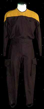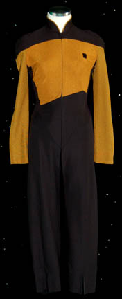 A Star Trek: The Next Generation female Operations gold Starfleet uniform made for wear during the series and/or ‘The Next Generation' movies. The jumpsuit is black with Operations gold sleeves and upper torso. There is gold trim around the collar, a small Velcro patch on the left breast for a … |