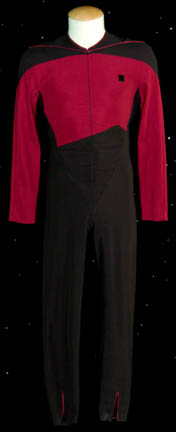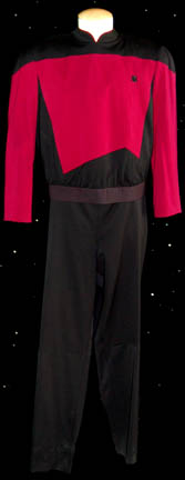 A male first season Star Trek: The Next Generation Starfleet Command Red uniform made for wear during the series. The jumpsuit is black with Command red sleeves and upper torso. There are two bands of red trim around the collar, a small Velcro patch on the left breast for a … |