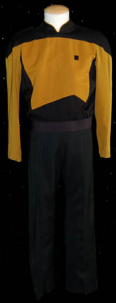 A Starfleet operations gold uniform in the third season style made for wear on the Star Trek: The Next Generation series. The jacket is gold and black with gold trim around the collar. It has a zip and snaps up the back and a small Velcro patch on the front … |