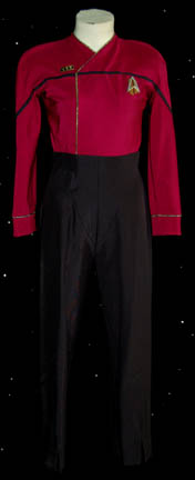 A costume featured in various episodes of Star Trek: Voyager for wear by Garrett Wang in the role of “Ensign Harry Kim”, Operation Officer of the starship “Voyager”. The costume is an off-white, pleated, long-sleeved tunic with zips/clasps down the front and for cuff adjustment, a maroon vest of a … |