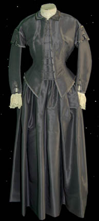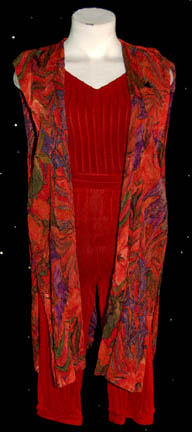 A costume featured in various episodes of Star Trek: Voyager. The costume is for wear by Kate Mulgrew in the role of the intrepid “Captain Kathryn Janeway” of the Starship “Voyager” and is a full-length, sleeveless black velvet dress with a red, textured, floral design, asymmetrical neckline and a zip … |