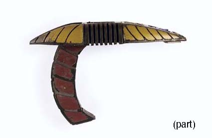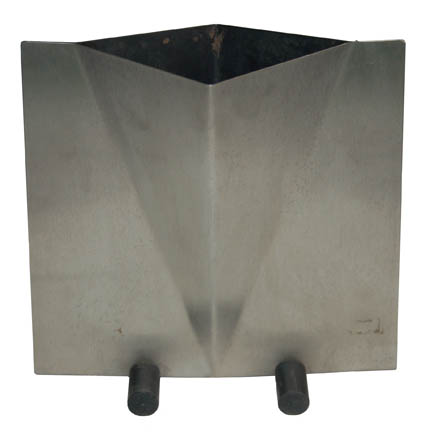 This futuristic metal vase was used as set dressing during the filming of Star Trek episodic television. The geometric design is a convex ‘V' that forms a diamond opening at the top and there are two black plastic cylinders at the bottom to support the vase frame. Measures approx. 8 … |