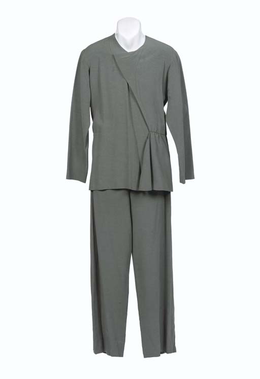 A long-sleeved shirt, and a pair of matching pants of green cotton -- worn by Patrick Stewart as Picard in "All Good Things," the final episode of <I>Star Trek: The Next Generation</I>; with corresponding wardrobe tag (2) |