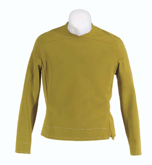 A long-sleeved men's Starfleet uniform shirt of mustard/gold polyester doubleknit with a unique arched saddle yoke, notched sleeve seam, and invisible zippers on left back yoke seam and left side front, unfinished without hems or collar -- designed by William Ware Theiss, believed to be a prototype for <I>Star Trek: … |