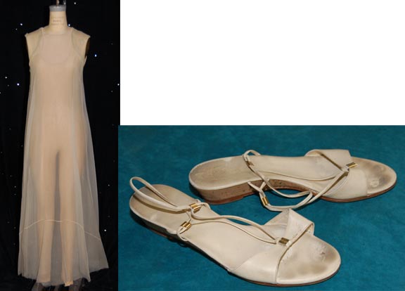 A Vulcan maiden costume lot featured in Star Trek III: The Search for Spock. The costume is a two piece gown, a form fitting flesh tone under suit with a gauzy off white gown for wear over. A piece of gold-colored metal costume jewelry that consists of two parts; the … |