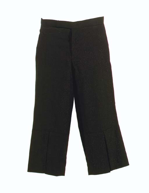 A pair of <I>Original Series</I>-style woman's cut pants, calf-length, made from black gabardine with woven metallic glint and flared pleated cuff -- believed to have been made for <I>The Original Series</I> or for <I>Star Trek: Phase II</I> |