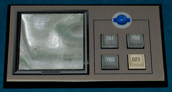 A piece of smoked acrylic with beveled sides, a graphical application adhered to the front, and a series of faux, rubber buttons, with a blue hued ‘electronic eye' and a reflective square application, all appearing in various episodes of Star Trek: Enterprise as a ‘com panel’. This is the type … |