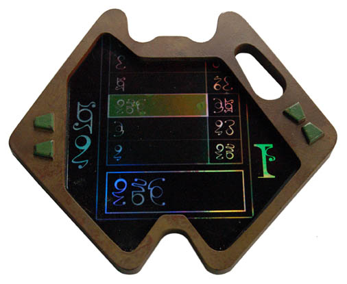 An alien PADD (Personal Access Display Device), roughly hexagonal in shape with cutouts on either end with raised green colored faux buttons, and a reflective display ‘screen' featuring ‘Orion’ character letters. The reverse has metallic gold adhesive details applied. Believed to have been featured in the Star Trek: Enterprise episode … |
