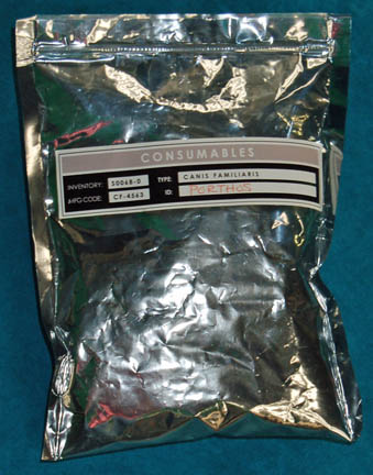 “Porthos” (Breezy) was “Captain Archer's” (Scott Bakula) beloved pet beagle featured throughout the Star Trek: Enterprise series. This is his food that comes in an opaque silver packet with a resealing top and a label on the side that reads “Consumables” with various information such as Porthos’ name and his … |