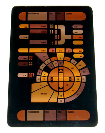 A piece of set dressing believed to have been used in various episodes of Star Trek: The Next Generation. The item is a rectangular shaped piece of smoked acrylic with graphical applications adhered to the reverse that appear to be controls for a stasis field of some sort. While usually … |