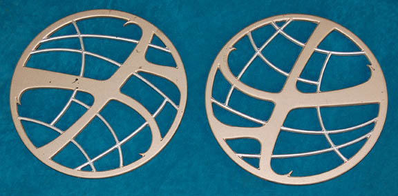 A pair of matching items featured as set dressing in various episodes of Star Trek: Enterprise like the pilot movie “Broken Bow” made from fashioned composite material painted metallic pewter with silver designs. The items feature remaining double stick adhesive on the reverse and measure 9.5 inches diameter. |