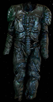 The Hirogens are a strong nomadic race of hunters featured in multiple Star Trek: Voyager episodes including “Message in a Bottle” and “Hunters”. A black full length cast rubber body suit painted with silver details to give it an armored appearance, with matching gloves, and boots. The right breast features … |